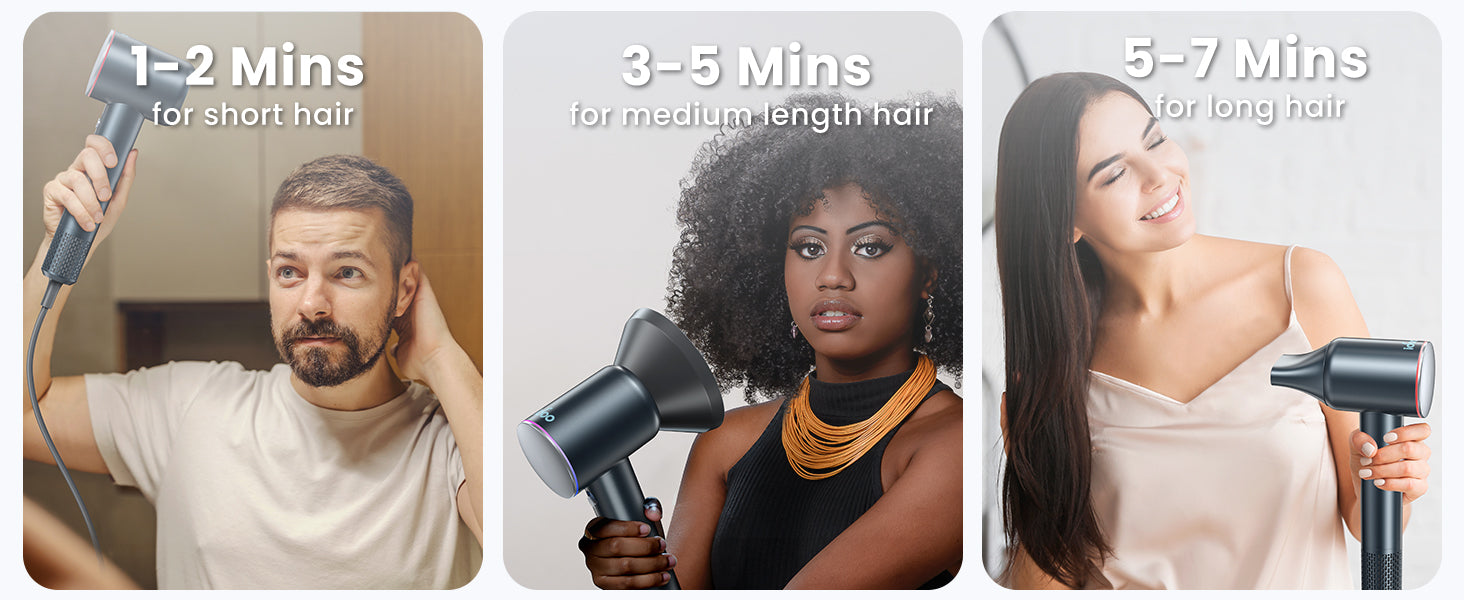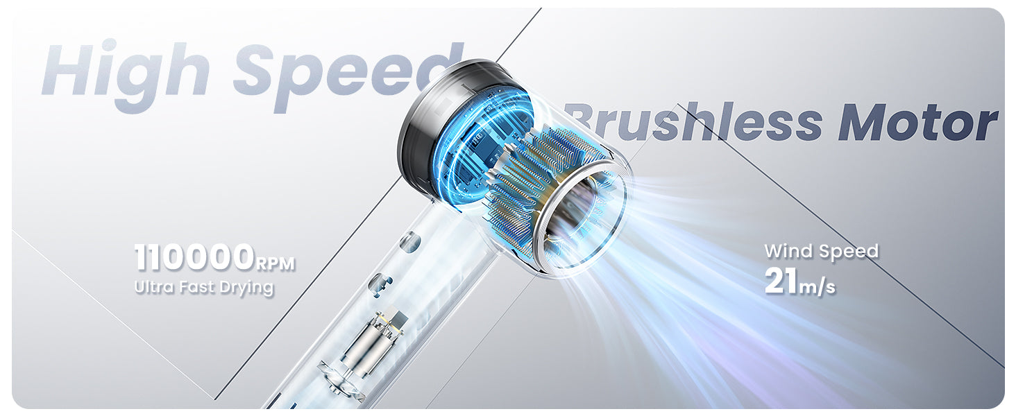- Fast Drying Power: 110,000 RPM brushless motor delivers airflow up to 21m/s for 3× faster drying.